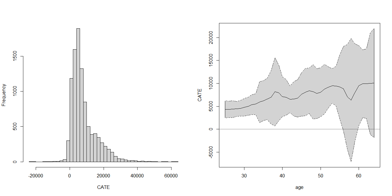 The left panel of the figure below reports the distribution of CATE estimates across all observations, which are as expected mostly positive, but exhibit large variation. The right panel shows how the CATE estimates and their 95% confidence intervals differ with age for a hypothetical average individual. Unsurprisingly, the estimated effect of 401(k) eligibility is larger for older individuals, even after conditioning on income. This result underlines the importance of convincing also young individuals that saving for retirement is sensible.